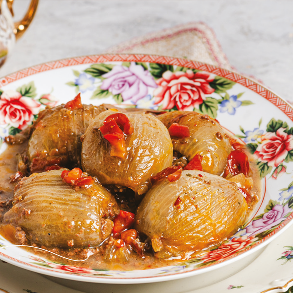 גלדי בצל ממולאים בתערובת בשר מתובלת, מבושלים עם פלפלים ברוטב עדין.