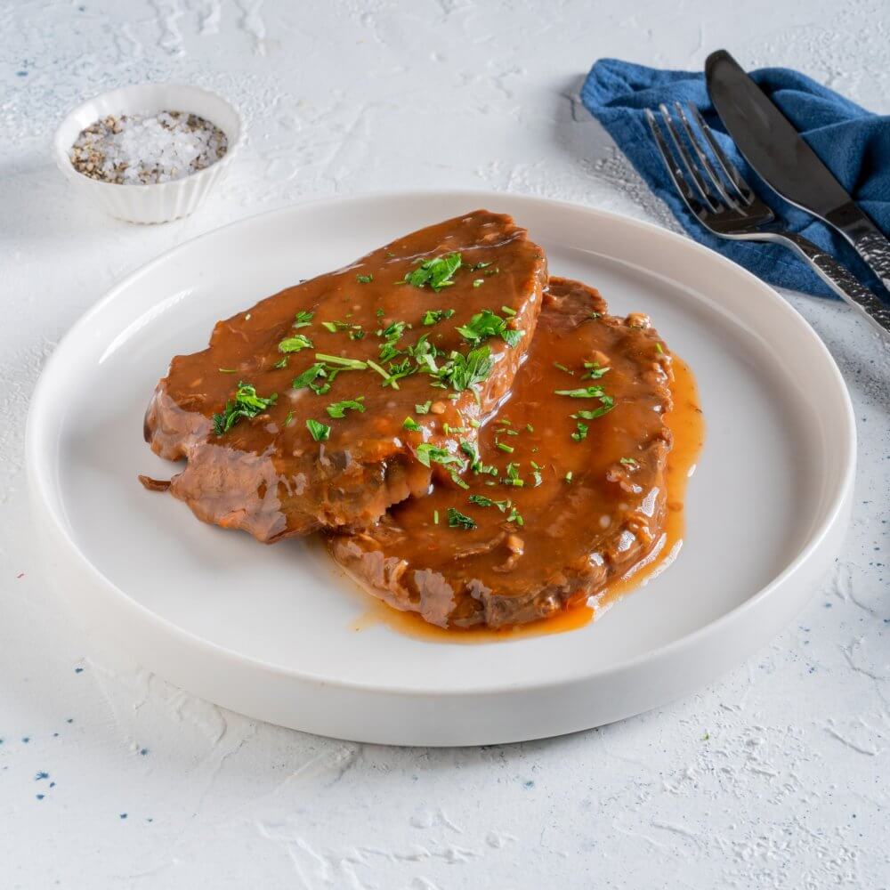 פרוסת בקר רכה ועסיסית ברוטב ברביקיו מתקתק