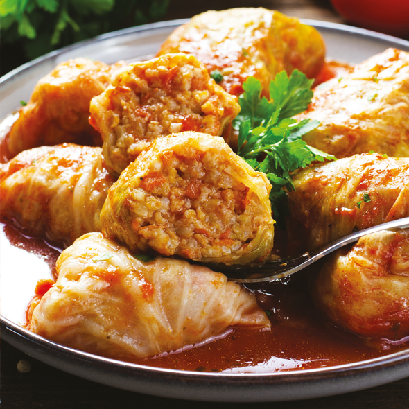 מנה מפורסמת מהמטבח ההונגרי, עלי כרוב ממולאים בבשר ואורז, מבושלים ברוטב עגבניות מתקתק.