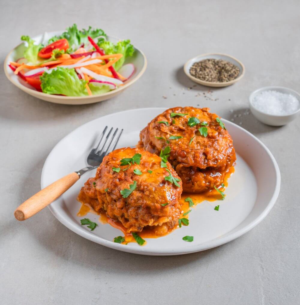פרוסות תפו”א במילוי בשר המתבשלות בבישול איטי ברוטב עגבניות פיקנטי